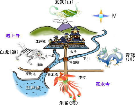 | 徳川家康は江戸入府と同時に「江戸城」と「江戸の町」を作る綿密な都市計画を構築していました。江戸城は先に太田道灌が築いた平山城がベースになるが、城下町は平地に作ることを基本としました。 江戸の人々にとっての理想郷として、中国の都「長安」で隆盛した天文学と地理学を合わせた「陰陽学」を町作りの原理とし、それを具体化した「四神相応の地形」を範として「江戸の町づくり」を進めることとしました。京都の平安京も「四神相応」の原理に基づいて作られました。この考え方は家康の側近として仕えた「天海大僧正」も強く支持しました。 その陰陽学では、宇宙を司る東南西北の四神を祀る以下のような地形を基本として都市計画を進めるよう示唆しています。 東=「青竜」が宿る川、南=「朱雀」の神が宿る池か海、西=「白虎」の神が宿る道、北=「玄(黒)武」の神が宿る山 【京都平安京の場合】 東=鴨川、南=巨椋池(現埋立地)、西=山陽道、北=船岡山 【江戸の場合】 東=平川、南=隅田川〜江戸湊、西=東海道、北=麹町台地〜富士山 *この配置により虎ノ門とか竜の口などの地名が残されている。 【江戸の町の四神相応】 ![]() ★世界都市「東京」の四神相応の地形的骨格は、令和の現代もそのまま継承され町は発展し続けています。これは「国家はどうすれば成長させることができるか?」という問いに対する徳川家康の慧眼と言えるでしょう。 |